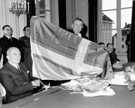Drapeau régional offert par M. Maurice Paradis, maire d’Alma, à M. Paul Germain, maire de Falaise en juillet 1969. Le maire Germain déploie le drapeau et à sa gauche, M. Pierre Tremblay, conseiller municipal de Falaise. Cette photo fut offerte à Mgr Victor Tremblay, « en hommage à l’homme illustre que vous êtes. » par Canada-Normandie. Source: Société historique du Saguenay-P002, S7, P02714-02