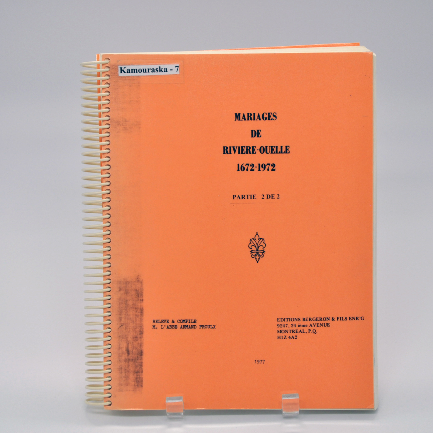 Publié en 1977 à Montréal par Éditions Bergeron & Fils, ce livre de l’abbé Armand Proulx retrace les mariages célébrés à Rivière-Ouelle de 1672 à 1972. L’ouvrage se présente sous la forme de deux cahiers. Il constitue une ressource précieuse pour les chercheurs en généalogie et pour les passionnés d’histoire locale. Il permet de suivre l’évolution des familles et des alliances sur trois siècles au sein de cette paroisse historique.