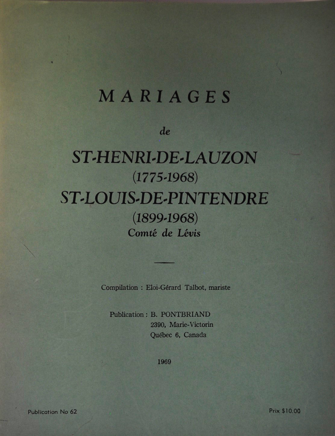 Publié en 1969, Mariages de Saint-Henri-de-Lauzon (1775-1968), Saint-Louis-de-Pintendre (1899-1968), comté de Lévis est un ouvrage incontournable pour les chercheurs en généalogie et l’histoire locale. Écrit par Éloi-Gérard Talbot, ce livre rassemble une vaste collection d’informations tirées des registres paroissiaux, couvrant près de deux siècles.