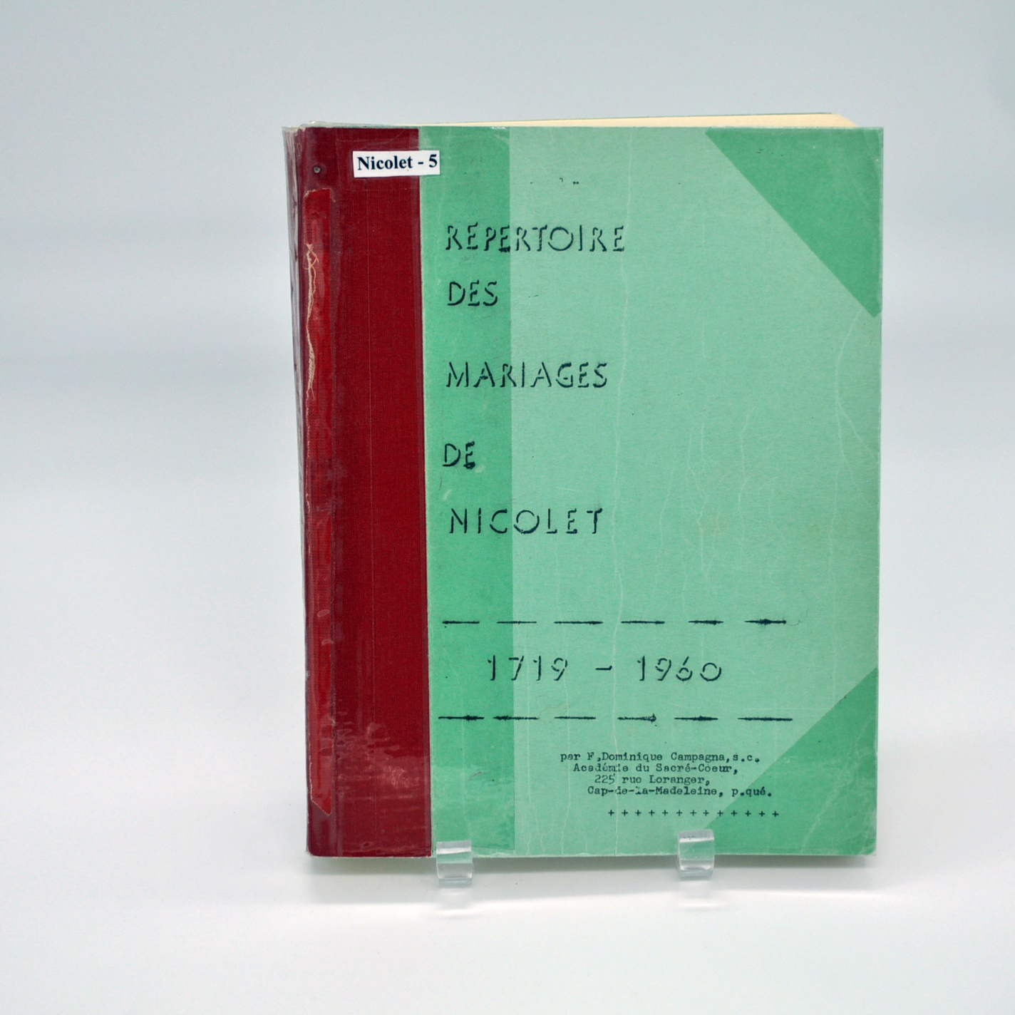 Publié en 1960, ce Répertoire des mariages de Nicolet (1719-1960) rassemble près de 250 ans d’histoire familiale et paroissiale. Préparé par le Frère Dominique Campagna, ce volume de 458 pages constitue une ressource essentielle pour les chercheurs en généalogie et les passionnés d’histoire locale.
